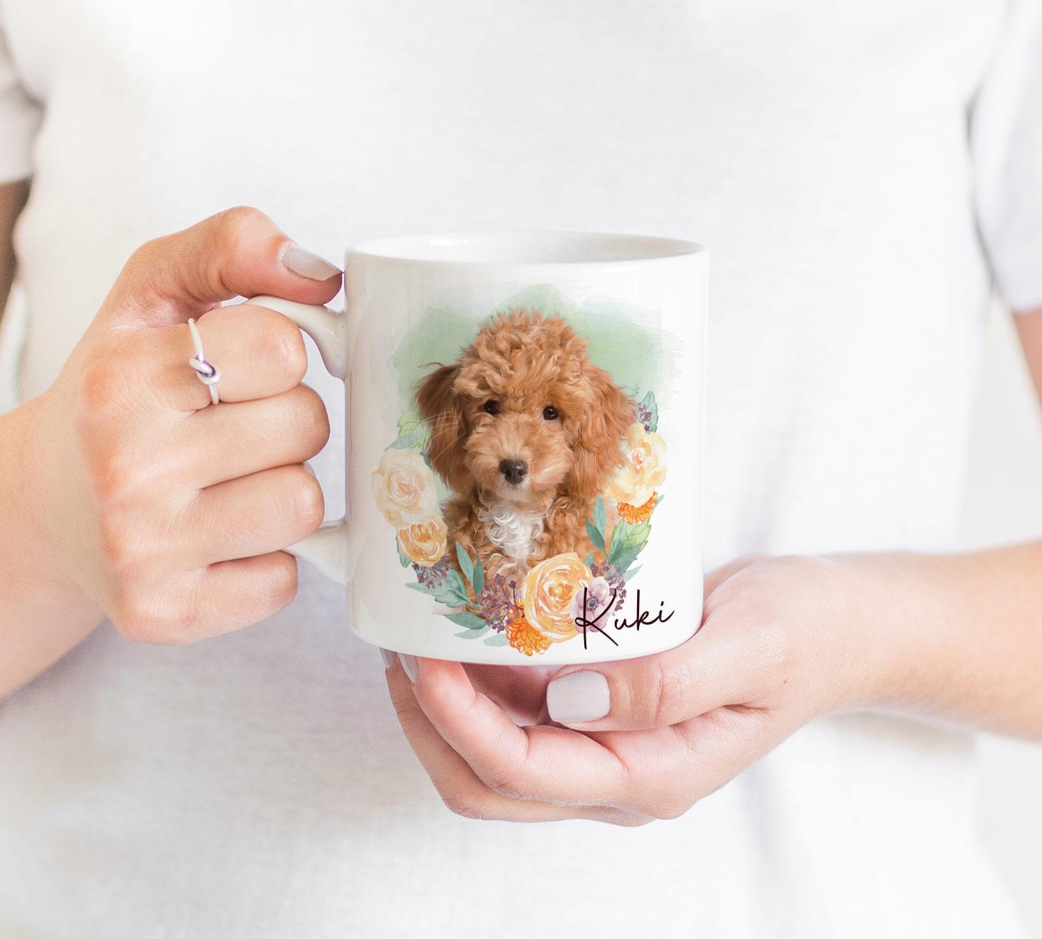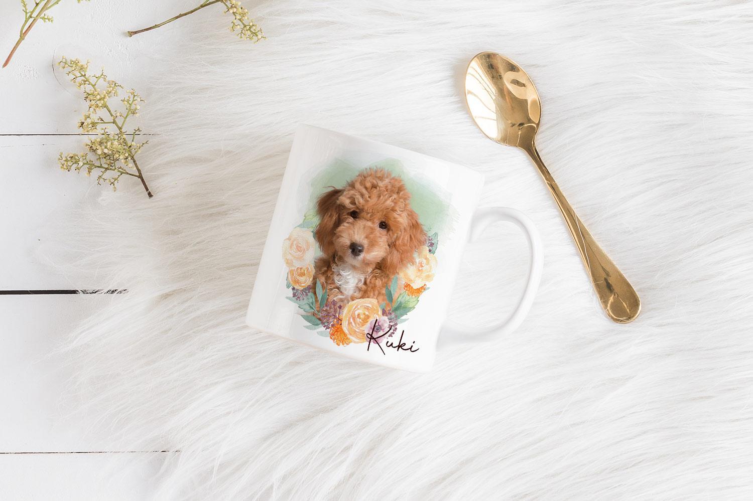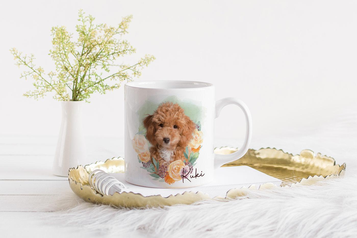 Learn more about our ‘Flower Wreath #5’ mug design, uniquely incorporated to model the popular custom portrait design of your pawed friend!
