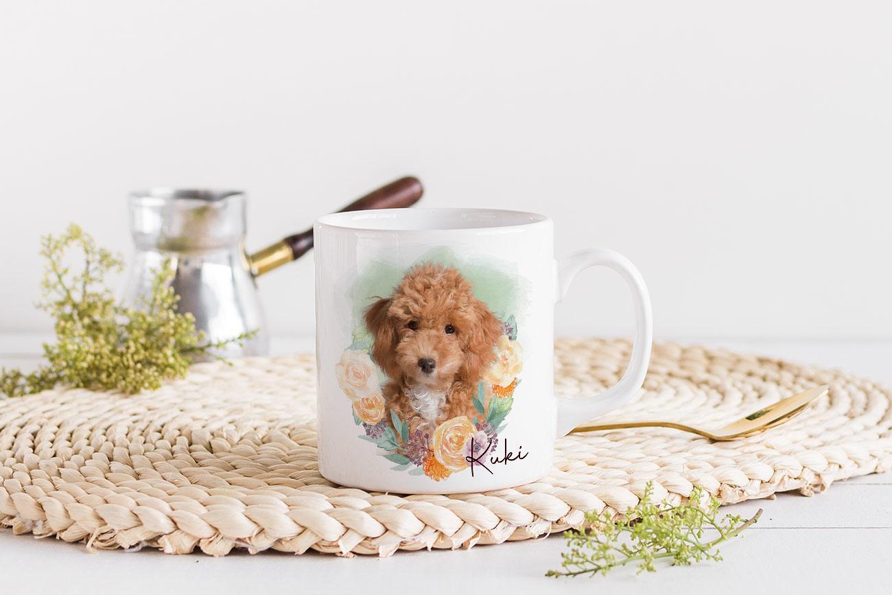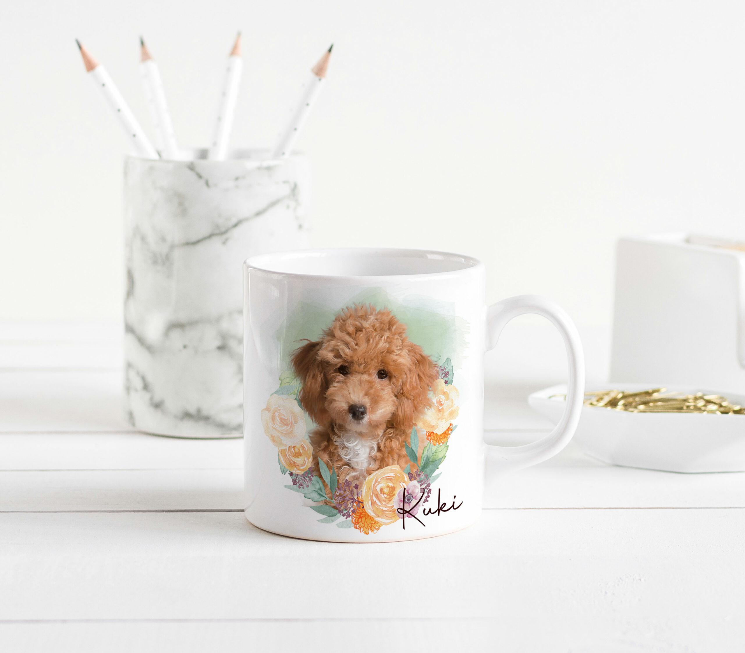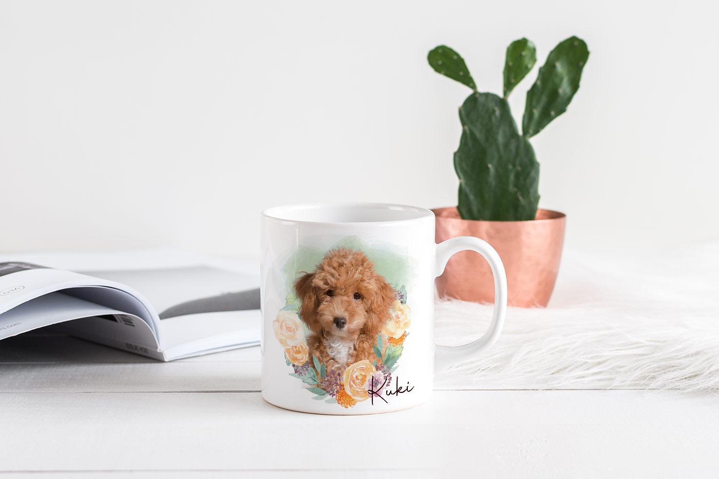 Learn more about our ‘Flower Wreath #5’ mug design, uniquely incorporated to model the popular custom portrait design of your pawed friend!