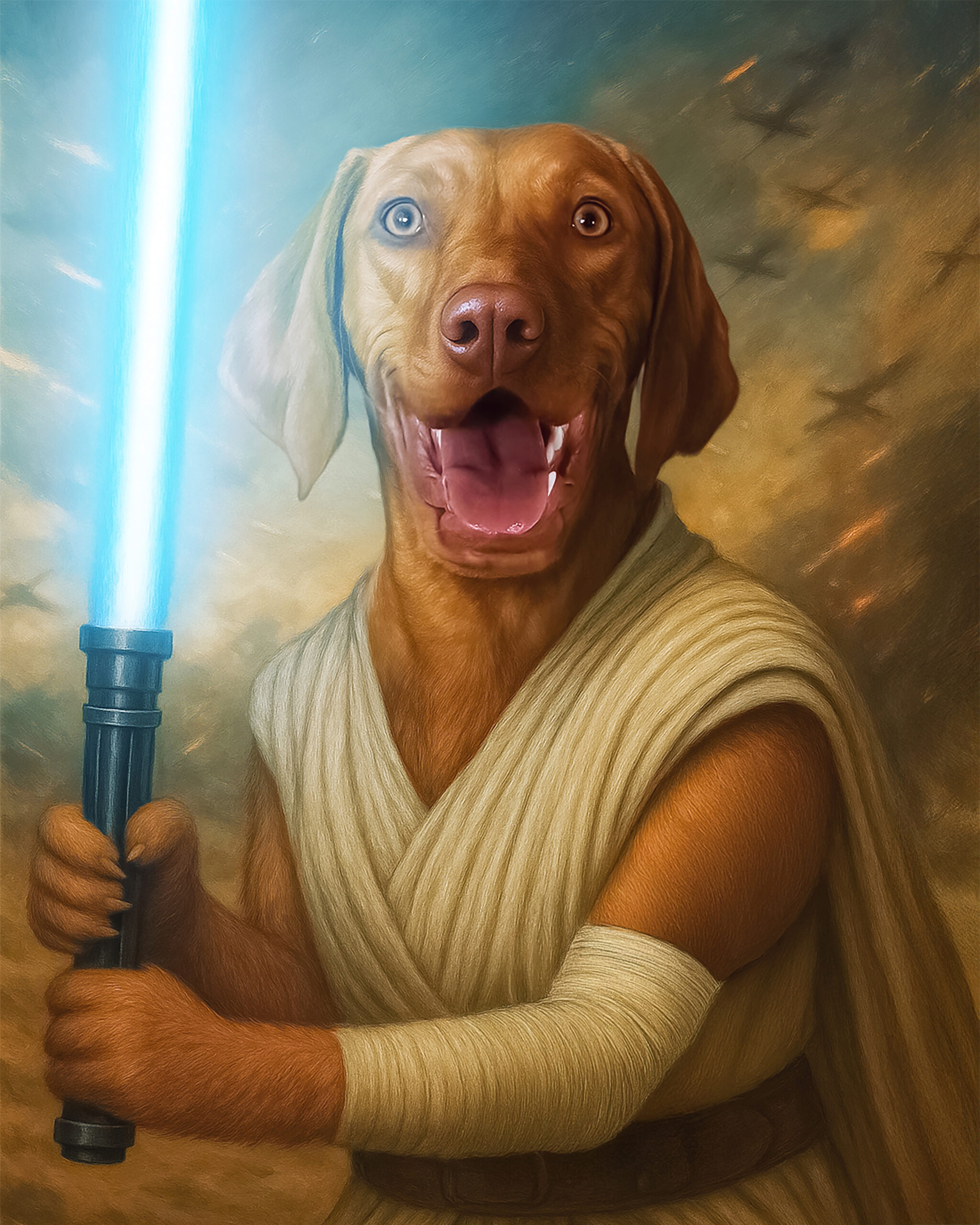 This piece of art brings a sense of adventure into your home with its glowing blue lightsaber, warrior stance, and dramatic galactic background. At the same time, it keeps your pet’s real expression, soft features, and playful charm.