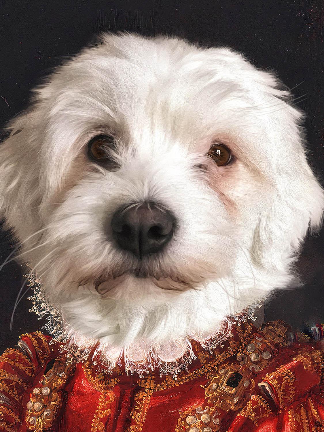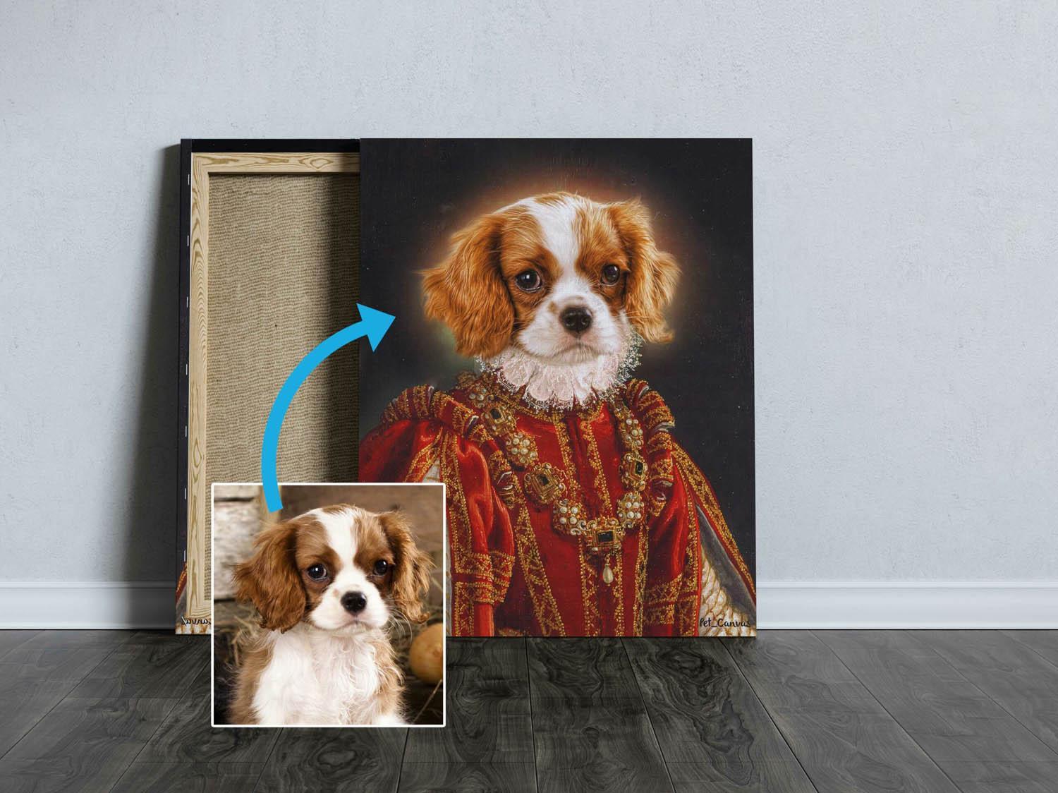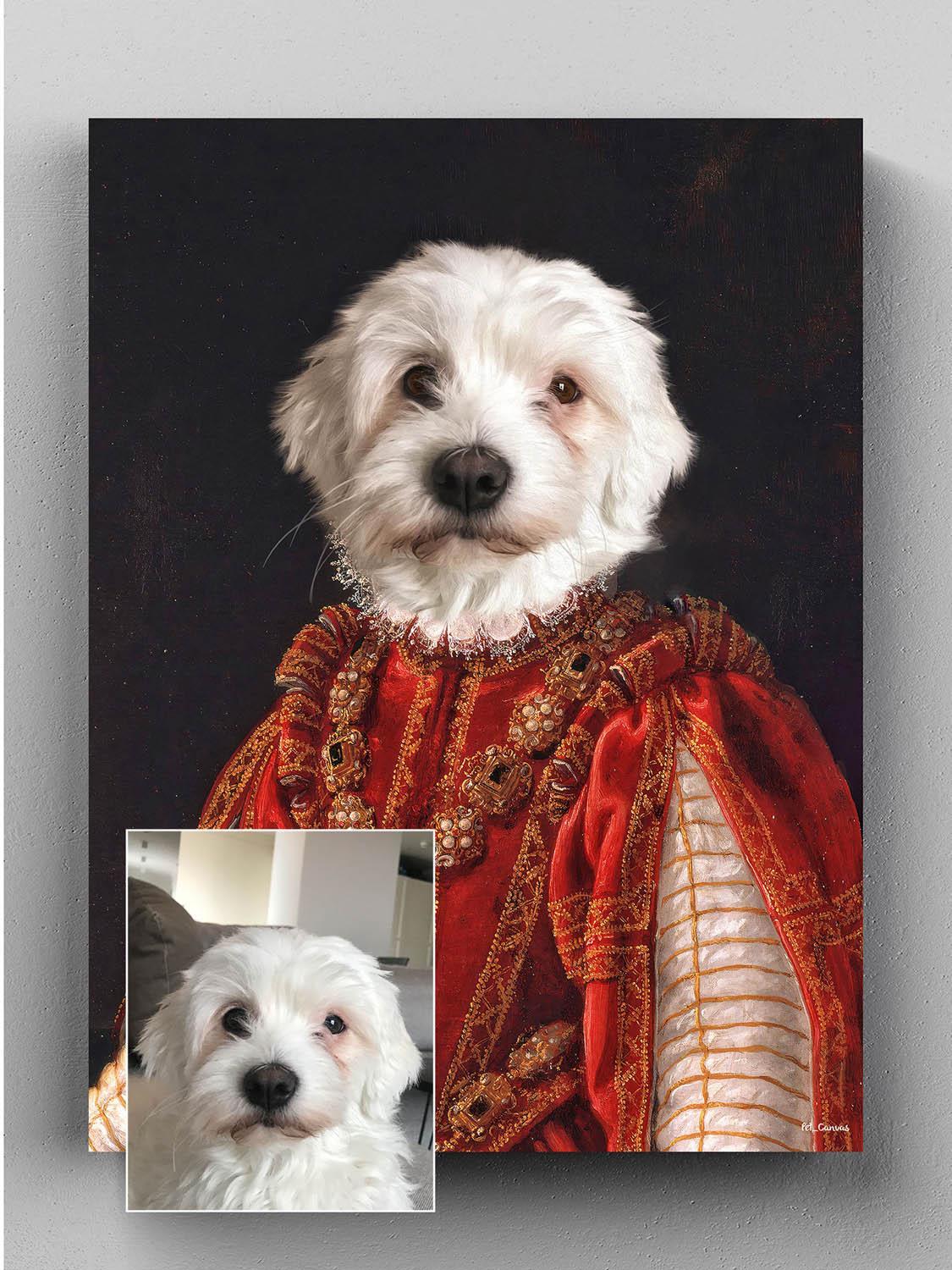 Display your paw friend in the best part of your home with the The Red Queen #13 portrait!  Personalized Pet Queen Canvas Painting is on Pet Canvas! Visit our website for a custom designed queen dog painting! The best gift for your little friend! Dog Canvas Painting