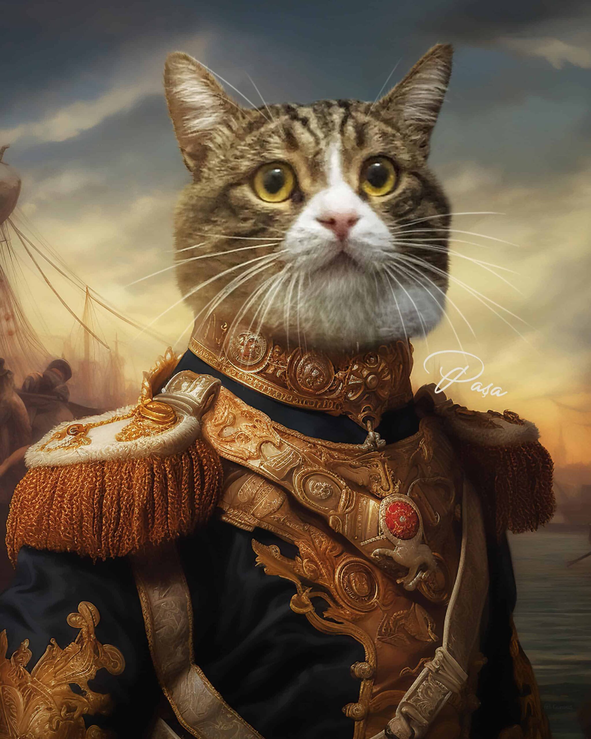 No templates, no filters, just real skill. Every detail, from how light reflects in their eyes to the small smile that makes up their face, is carefully thought out. Your pet isn’t just dressed up in a costume; they are turned into a famous person who fits perfectly into the painted world of classic maritime glory.