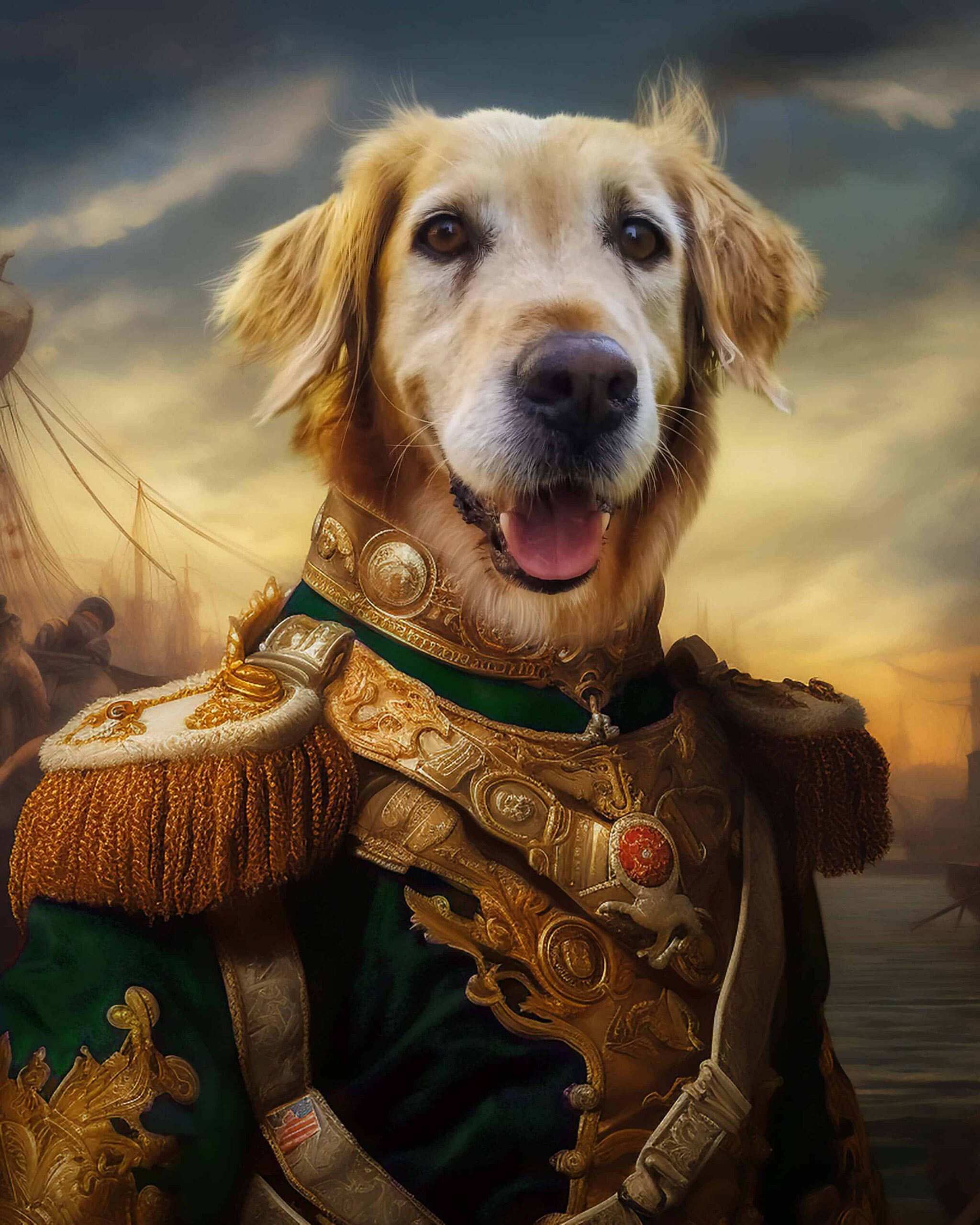 Your pet becomes the hero of this maritime story, dressed in a distinguished uniform rich with golden embroidery and elegant detailing. Each element — from the shoulder tassels to the deep navy tones — represents honor and grace. When you look at your Custom Design Pet Canvas, you’re reminded of your pet’s silent strength and the way they’ve guided you through every wave of life.